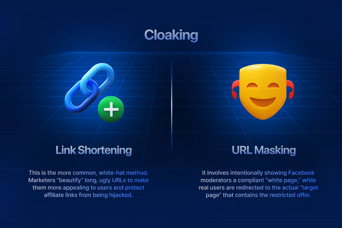 This involves tricking Facebook into approving ads that promote restricted content (e.g., gambling, crypto, adult). Reviewers see a clean page, while users are redirected to the real, non-compliant offer. Some advertisers also use “white washing” techniques—designing the ad to look compliant but switching content post-approval.